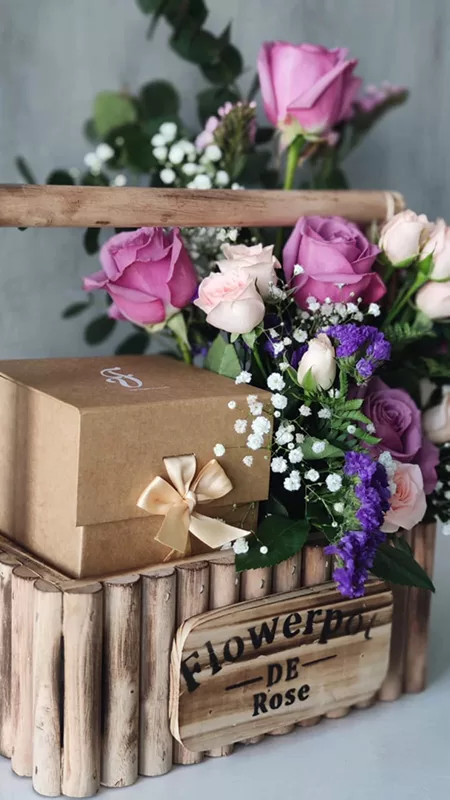 Solid wooden basket with fresh flowers and fillers. Also included in the arrangement is a magnetic chocolate box inclusive of 300g of assorted Belgian chocolates